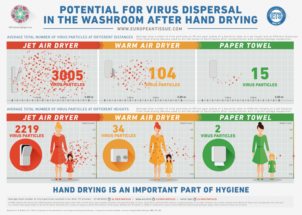 ECCMID, which is a Swiss-based non-profit scientific international organization, recently done the research and found out that tissue papers are a better option to choose for drying hands. Because they are more efficient in removing bacteria or viruses from hands compared to air dryers.